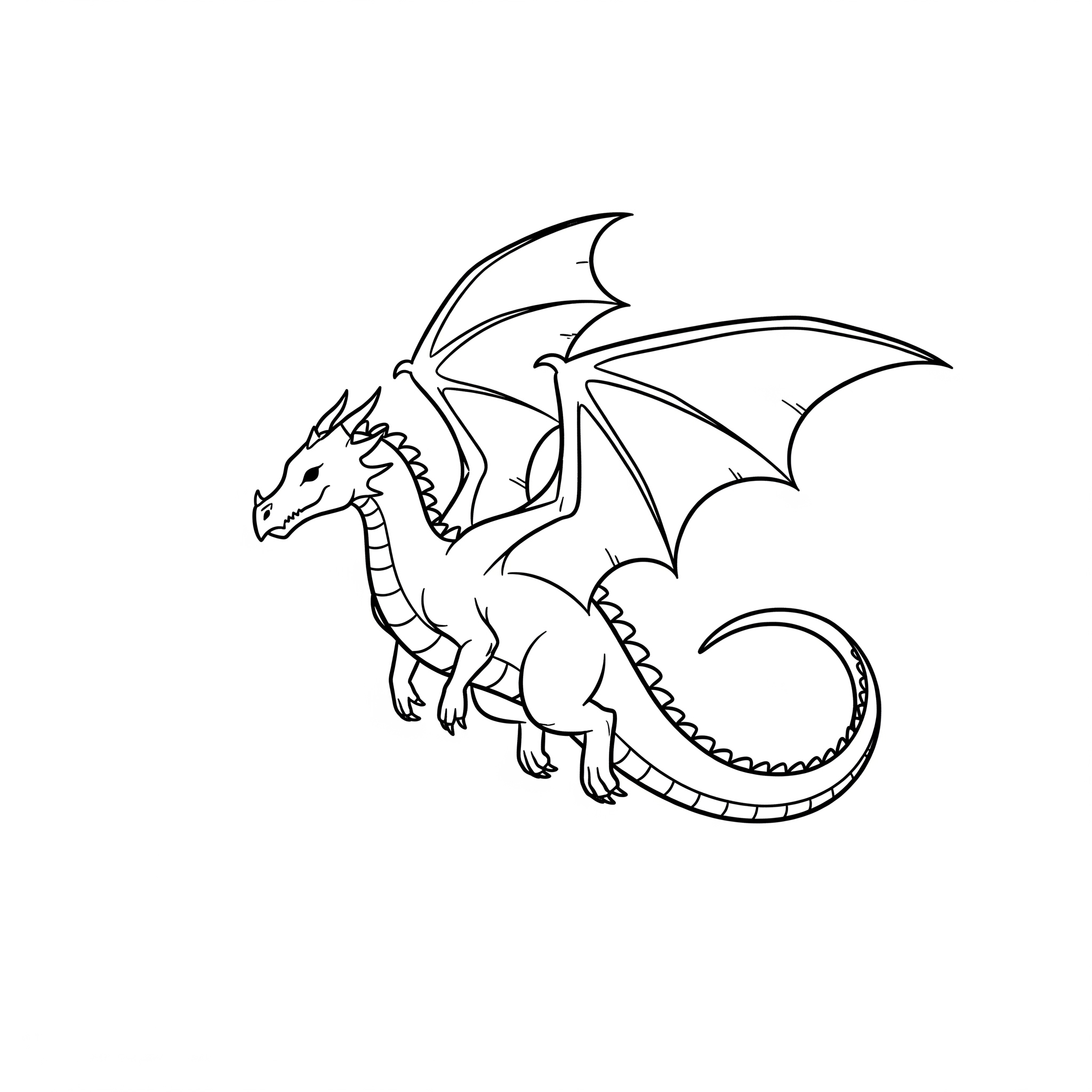 Obraz przedstawia czarno-biały, liniowy szkic lecącego smoka. Smok ma proste, ale majestatyczne skrzydła, długi ogon zakończony kolcami oraz rogi na głowie. Jego pysk jest zaciśnięty, a wzdłuż grzbietu biegnie rząd ostrych wypustek. Rysunek jest utrzymany w minimalistycznym stylu, idealnym do szybkiego pokolorowania lub jako podstawa do dalszych prac.
