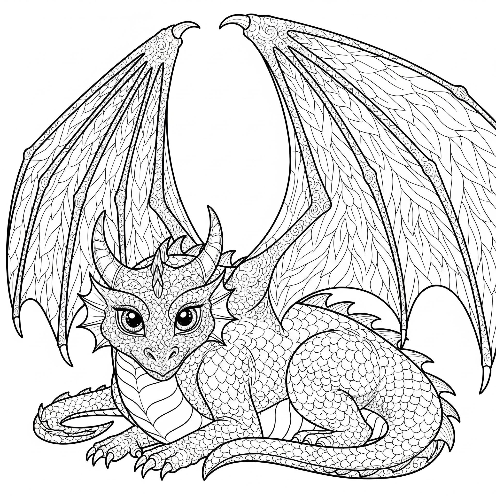 Na tym czarno-białym obrazku do kolorowania widoczny jest uroczy, mały smok z dużymi oczami, leżący z rozłożonymi skrzydłami. Ciało smoka pokryte jest szczegółowymi łuskami i wzorami, a na jego głowie widnieją małe rogi. Skrzydła smoka również zdobią misternie wykonane detale, idealne do kreatywnego kolorowania. Obrazek utrzymany jest w stylu fantasy, z dużą ilością drobnych elementów, co sprawia, że jest świetnym materiałem dla miłośników smoków i kolorowanek antystresowych, i jest dostępny do pobrania za darmo.