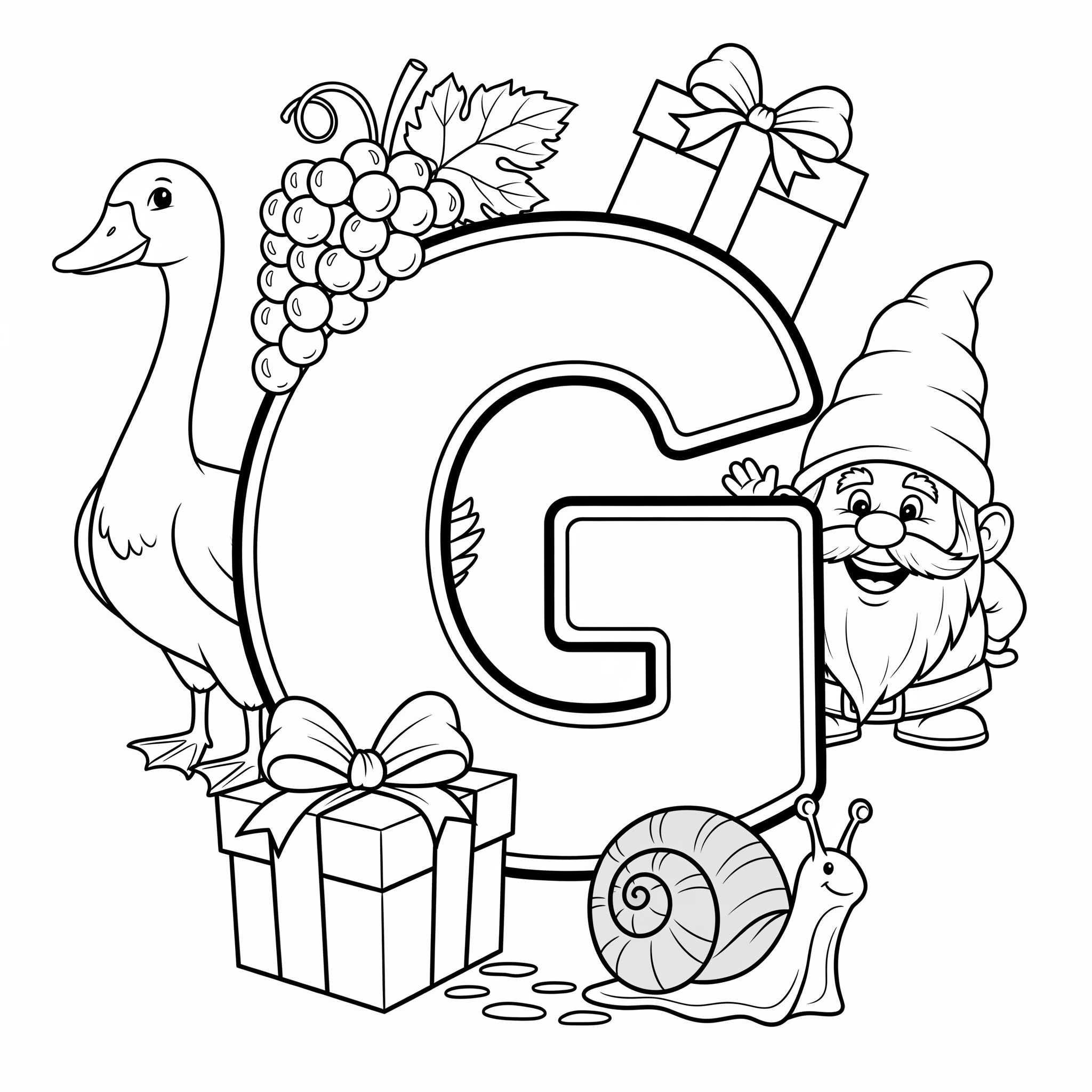 * **Gęś (Goose):** Z boku literki stoi wesoła gęś. Pokoloruj jej piórka na biało, a dzióbek i nóżki na pomarańczowo.