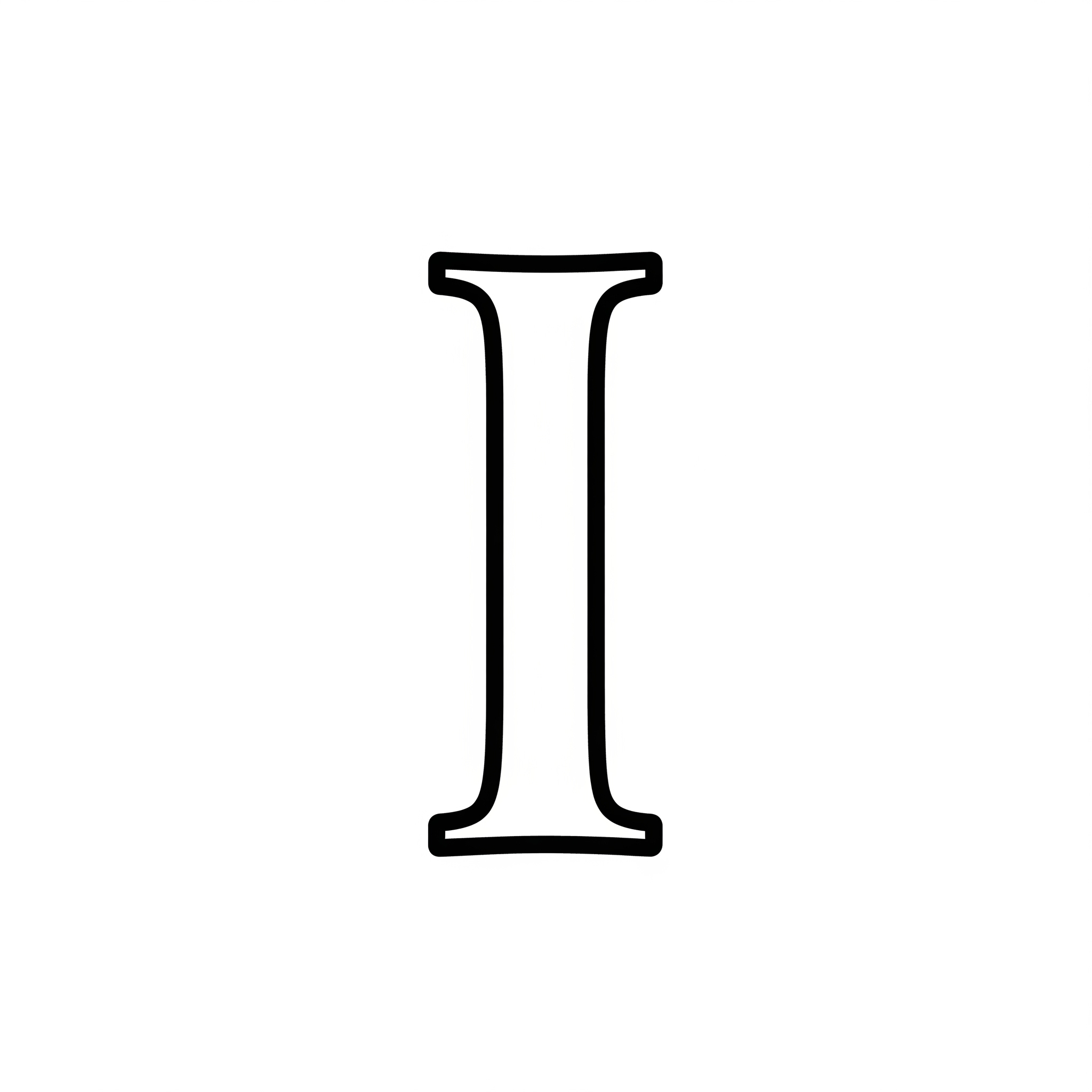Litera jest duża i wyraźna, umieszczona centralnie na białym tle. Jej krawędzie są pogrubione, tworząc gruby czarny obrys. Wnętrze litery jest puste i białe, co sprawia, że idealnie nadaje się do wypełnienia dowolnymi kolorami. Brak jakichkolwiek dodatkowych wzorów czy zdobień sprawia, że jest to klasyczna, podstawowa forma litery „I” do kolorowania.