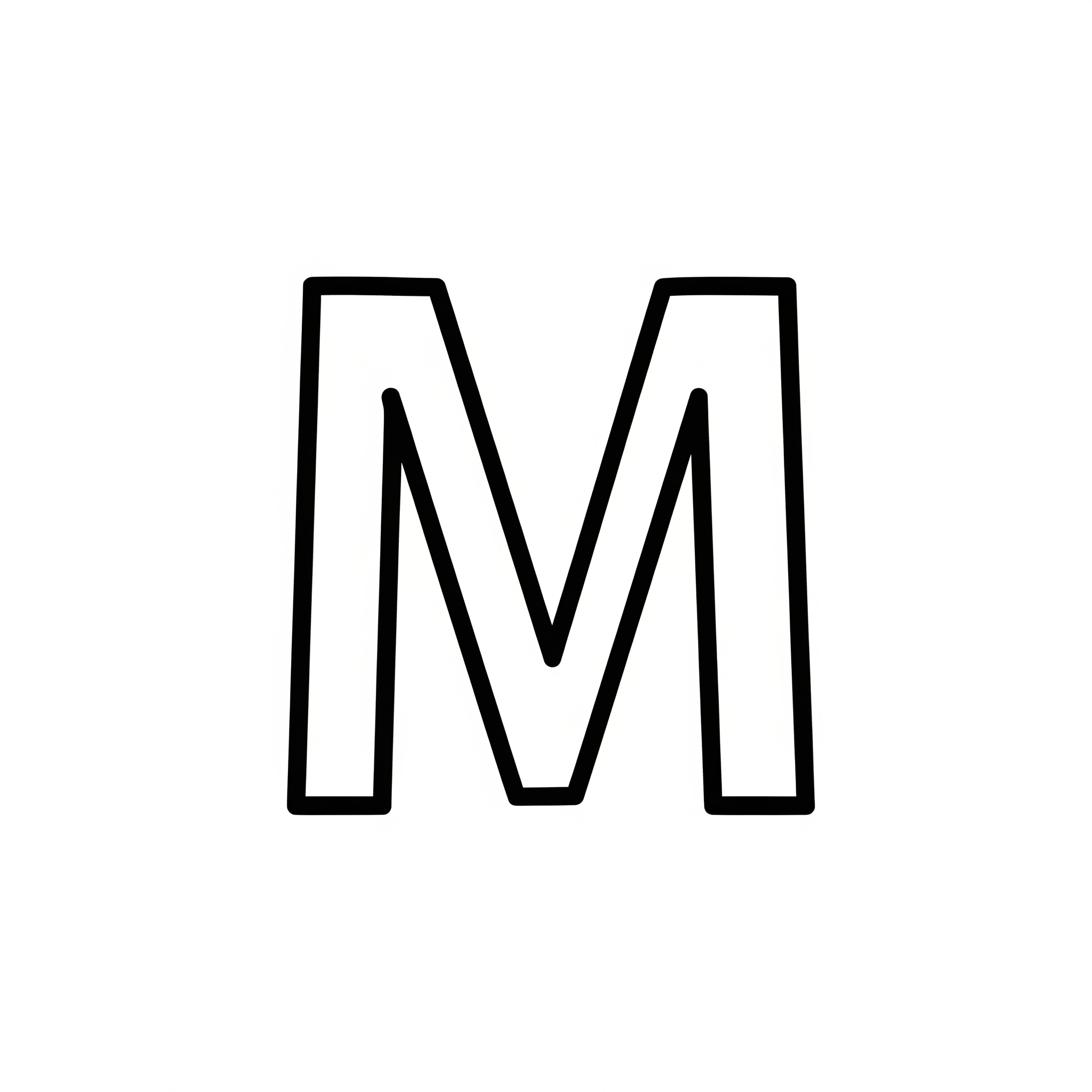 Litera jest duża i wyraźna, umieszczona centralnie na białym tle. Jej krawędzie są pogrubione, tworząc gruby czarny obrys. Wnętrze litery jest puste i białe, co sprawia, że idealnie nadaje się do wypełnienia dowolnymi kolorami. Brak jakichkolwiek dodatkowych wzorów czy zdobień sprawia, że jest to klasyczna, podstawowa forma litery „M” do kolorowania.
