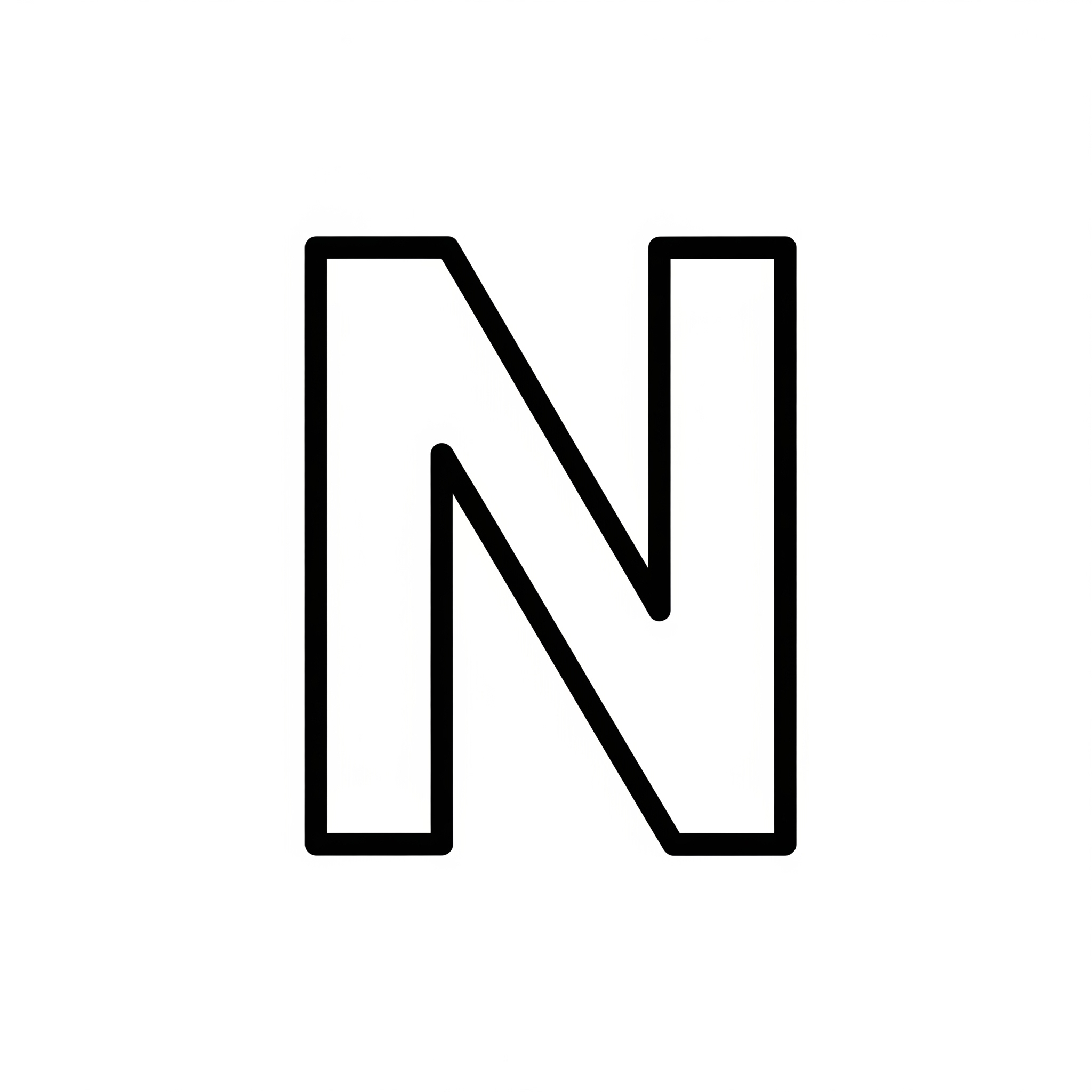 Litera jest duża i wyraźna, umieszczona centralnie na białym tle. Jej krawędzie są pogrubione, tworząc gruby czarny obrys. Wnętrze litery jest puste i białe, co sprawia, że idealnie nadaje się do wypełnienia dowolnymi kolorami. Brak jakichkolwiek dodatkowych wzorów czy zdobień sprawia, że jest to klasyczna, podstawowa forma litery „N” do kolorowania.