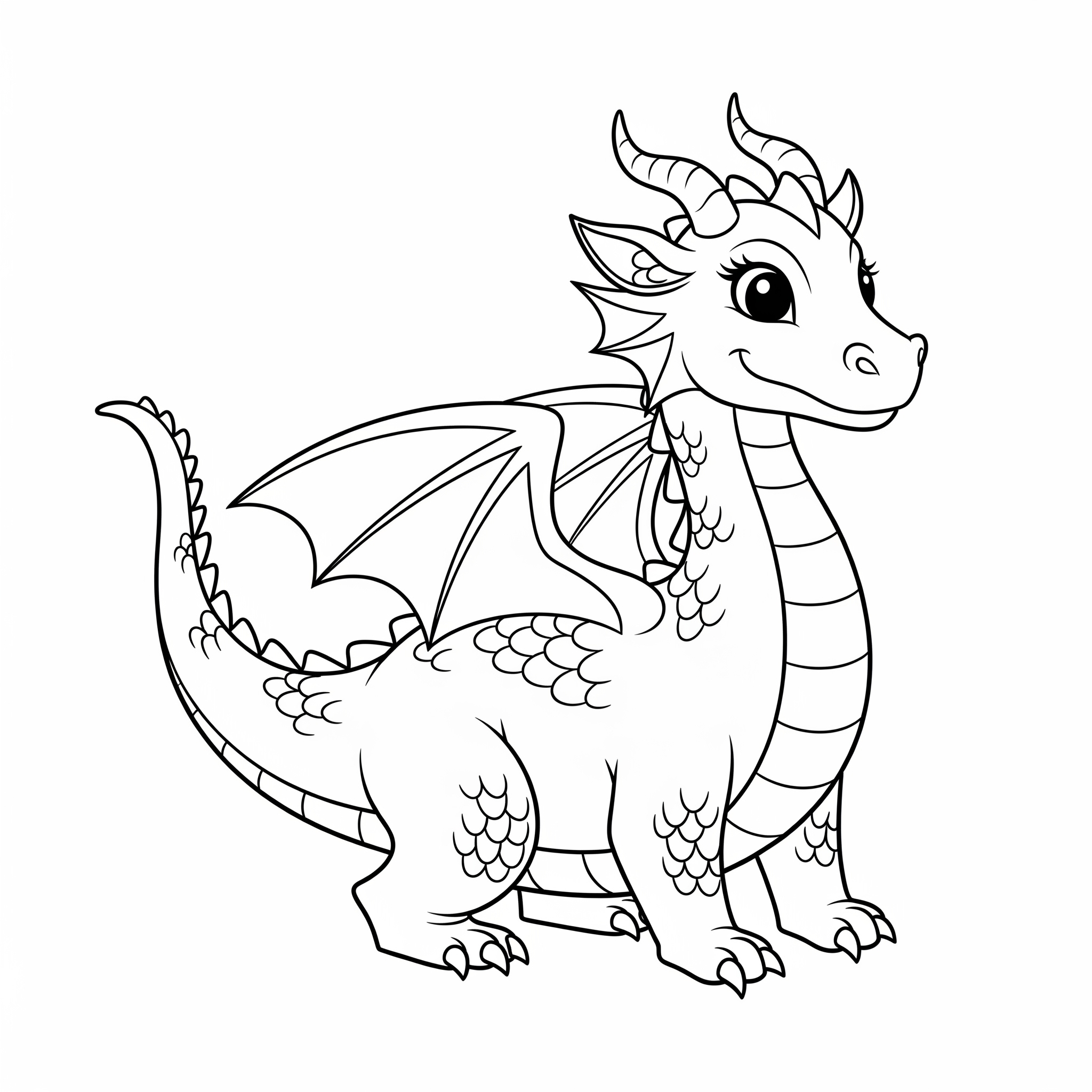Kolorowanka przedstawia czarno-biały, liniowy szkic uroczego, kreskówkowego smoka, idealny do kolorowania. Smok siedzi na czterech łapach, z lekko uniesioną głową i delikatnym, przyjaznym uśmiechem. Ma duże, okrągłe oczy, które nadają mu sympatyczny wyraz, a nad nimi widać delikatnie zarysowane rzęsy. Na głowie widoczne są dwa pary małych, zakręconych rogów, a pod nimi subtelne, kolczaste detale. Jego ciało jest pokryte wyraźnie zarysowanymi łuskami na grzbiecie i bokach, podczas gdy brzuch ma gładkie, poziome segmenty. Z pleców wyrastają małe, spiczaste skrzydła o prostej, ale eleganckiej budowie. Długi ogon jest również pokryty łuskami i zakończony ostrym szpicem. Całość kompozycji jest wyraźna, prosta i emanuje słodyczą, zachęcając do pokolorowania.