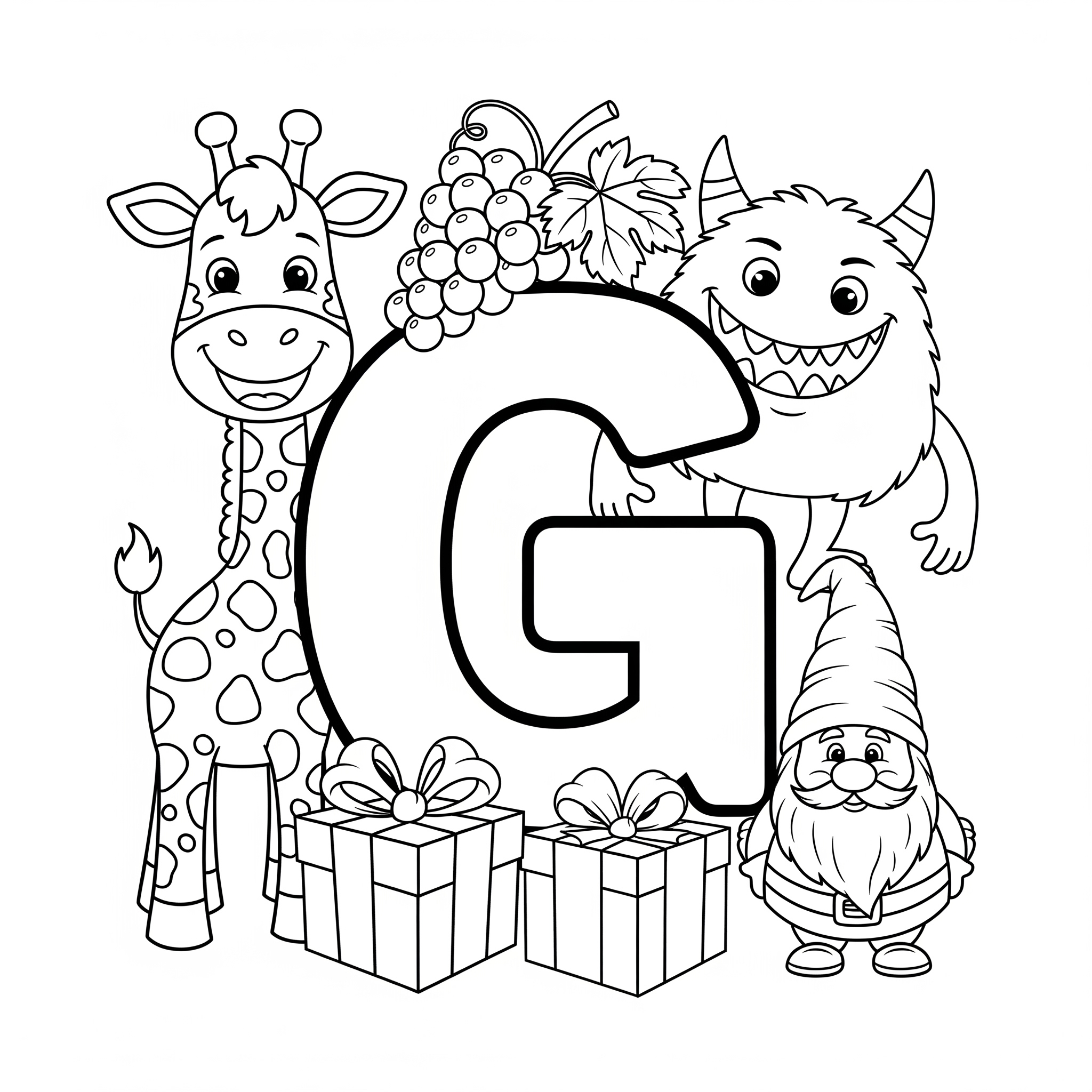* **Żyrafa (Giraffe):** Z boku literki stoi urocza żyrafa w kropki. Pokoloruj ją na żółto, a jej łaty na brązowo.